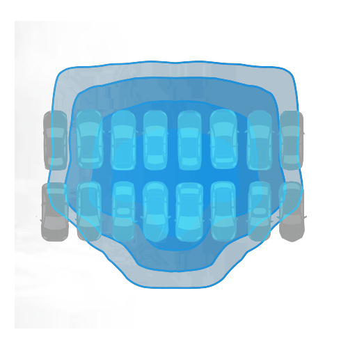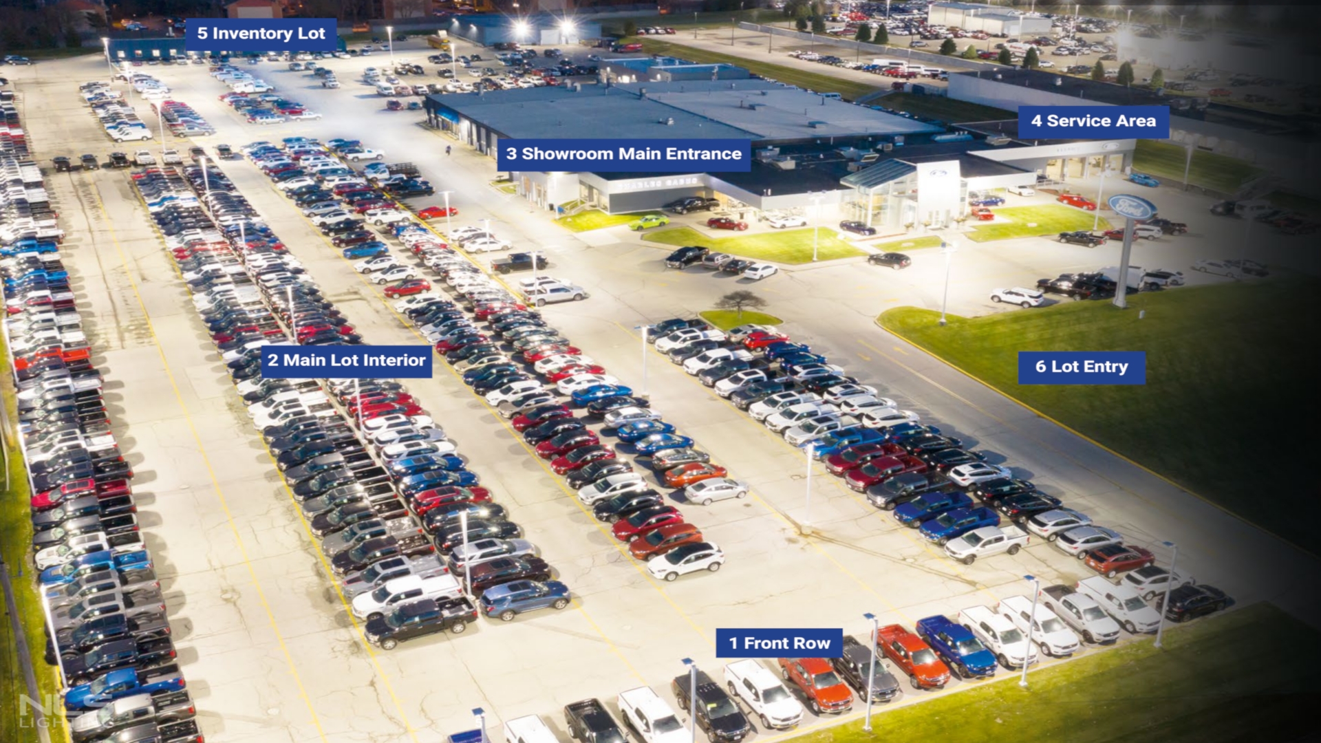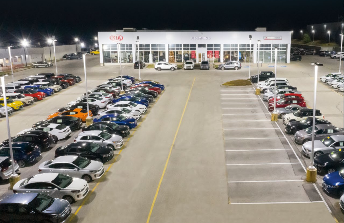 (T4A) Highest Light Levels along front line while throwing the highest light levels deep into the dealership and on second row of vehicles.