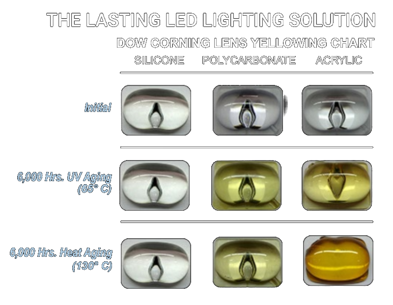 • Silicone optics will not yellow, crack, or chalk like competitors polycarbonate, acrylic, or PMMA optics which cause premature high rates of exponential depreciation