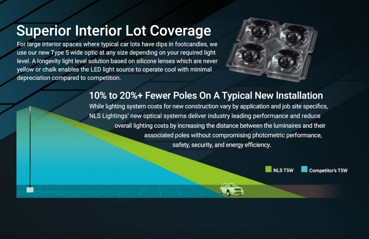 Light levels are recommended to be at least a 10 foot candle average according to the Illuminating Engineer Society to protect millions of dollars worth of inventory as well as the security of night time after hour security. NLS achieves this recommended light level with both our T4 Long and T5 Wide Automotive Distributions while minimizing the number of poles, luminaires, and energy.