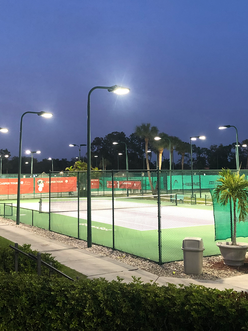 In the process of its upgrade, the Lifestyle Center’s Exhibition Tennis Court, located on the lakeside front of the two-story Clubhouse facility, was the first tennis court to be inspected. Its poor, existing lighting of 400 Watt HV was not inviting for tennis players, nor did it meet U.S.T.A. requirement in light levels and distribution. For this change, the Audubon Country Club looked to NLS Lighting’s specifically designed tennis court luminaire—VUE Tennis.