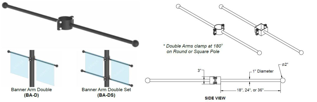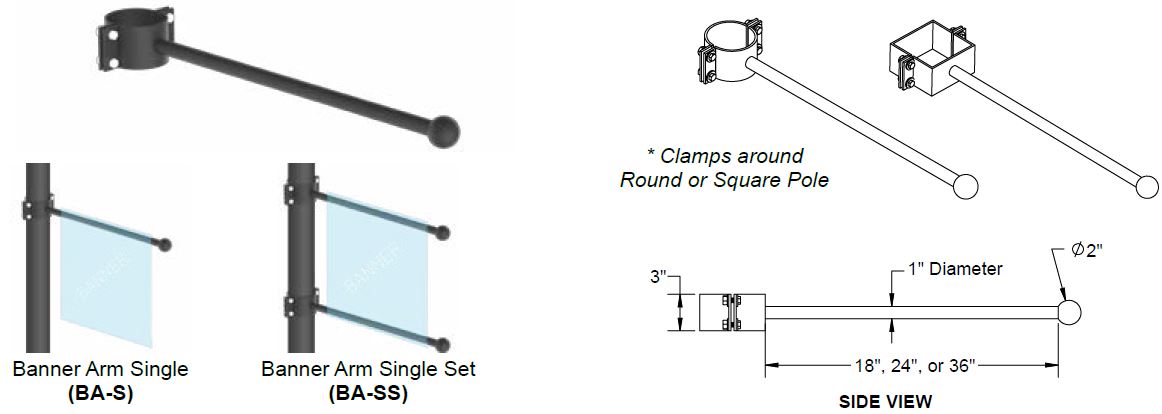 – Banner Arms are available for round or square poles and clamped using 3/8-16 hardware.