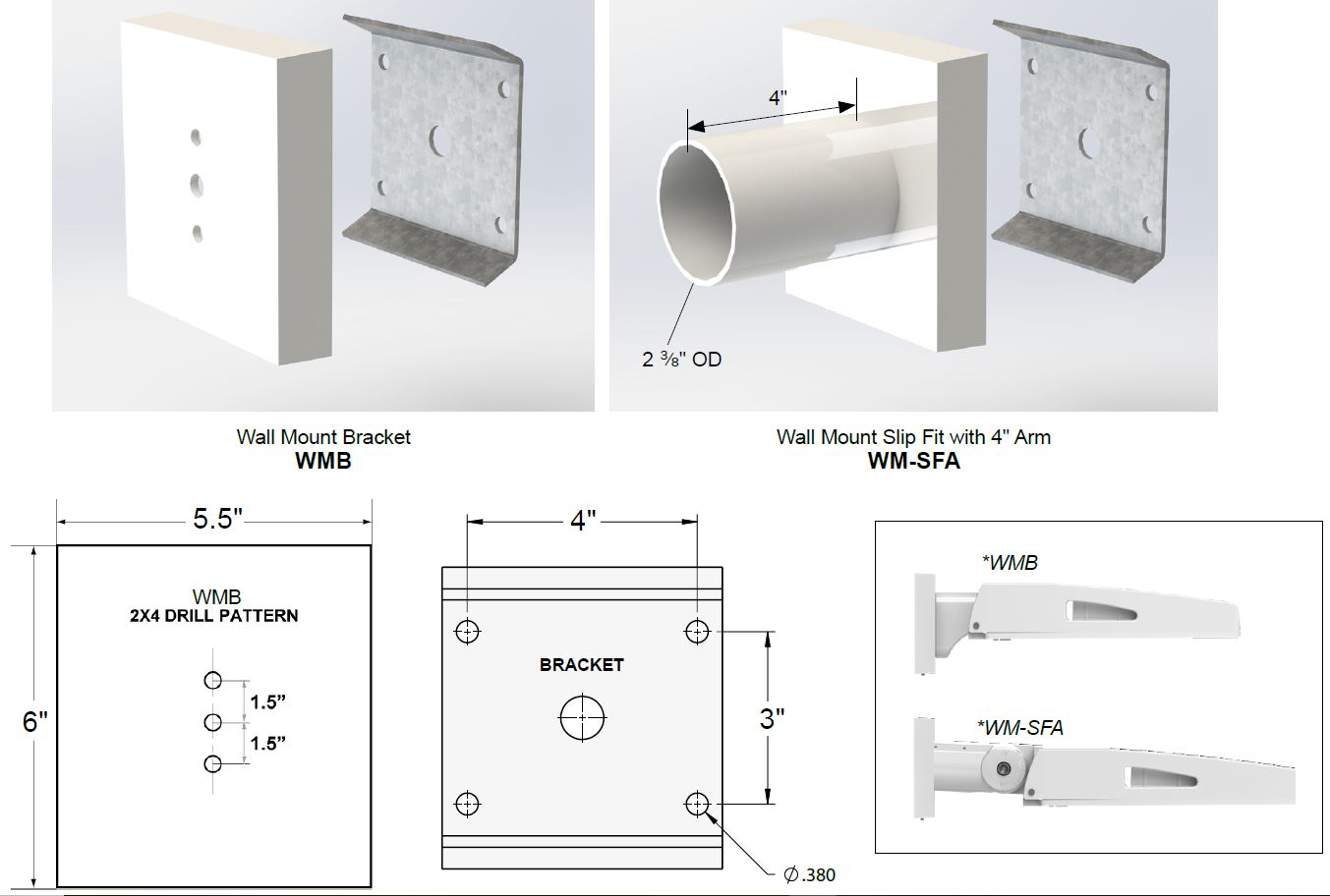 • Cast Aluminum plate for direct wall mount. An extruded aluminum arm mounts directly to a cast Wall Mount box. Wall Mount Slip Fit Arm is a standard 4-inch length with a 2-3/8 inch OD.